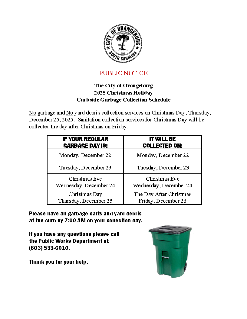 The City of Orangeburg 2025 Christmas Holiday Curbside Garbage Collection Schedule